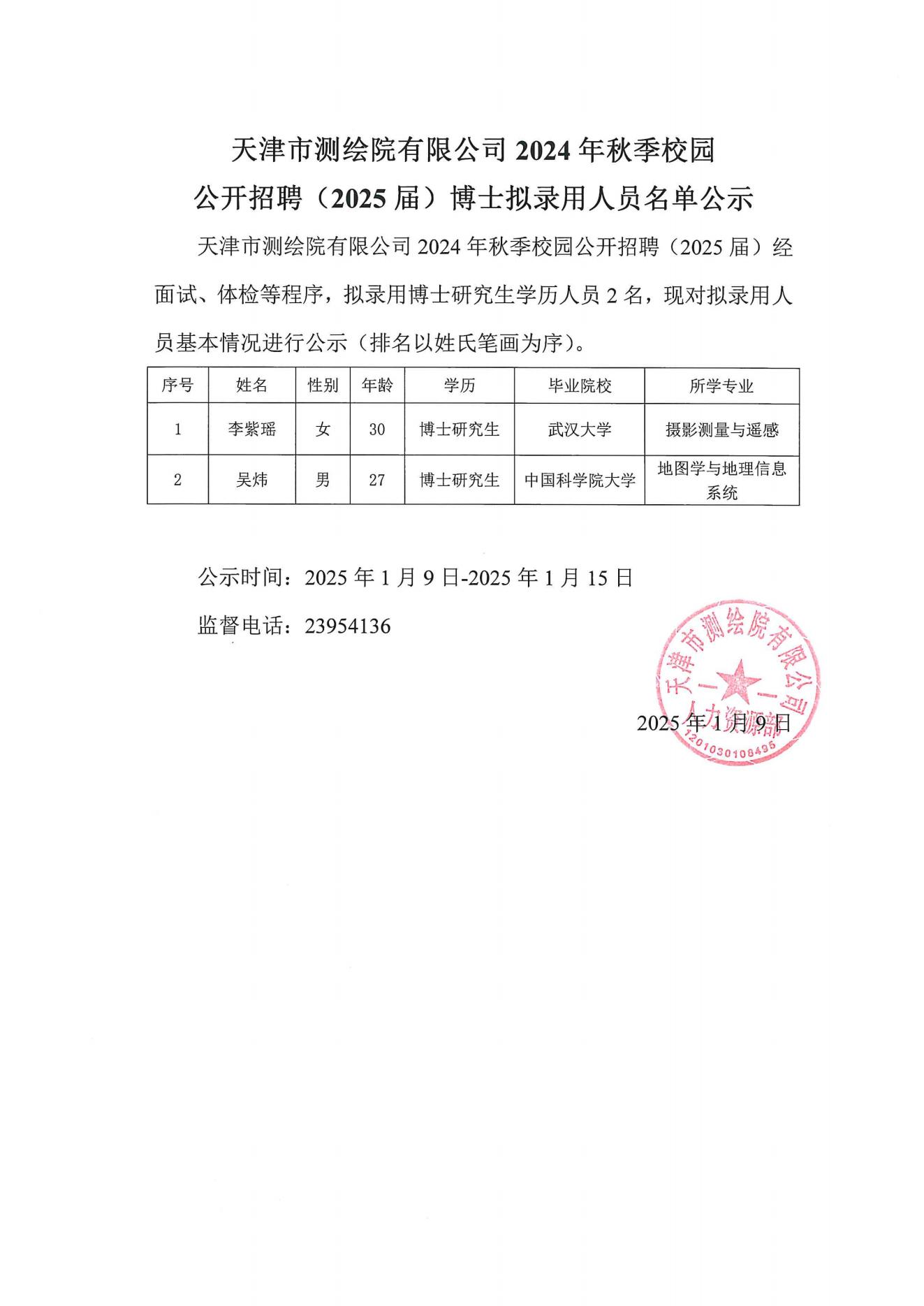 天津市測繪院有限公司2024年秋季校園公開招聘(2025屆)博士擬錄用人員名單公示