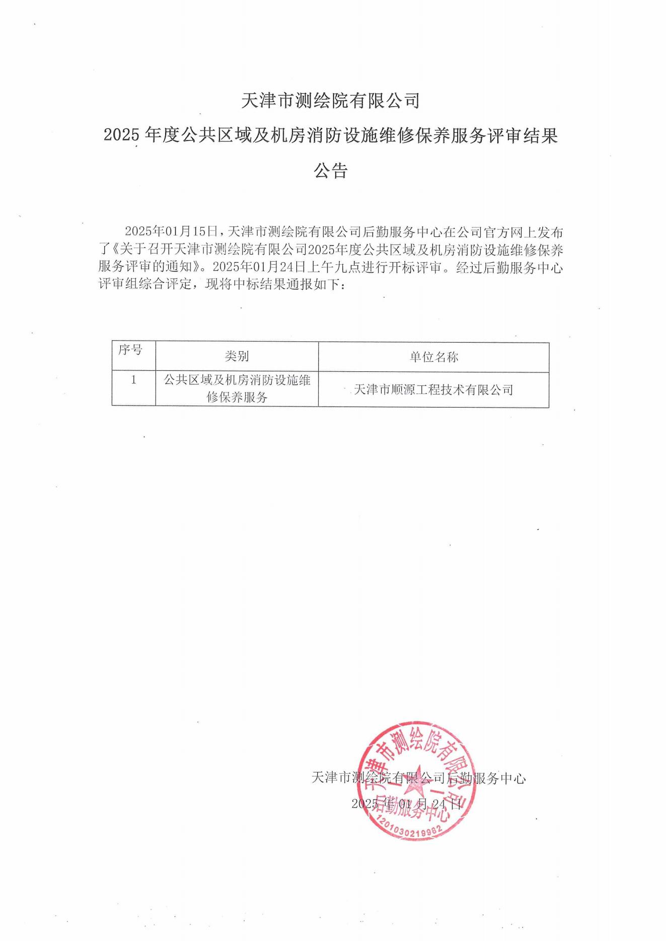 天津市測(cè)繪院有限公司2025年度公共區(qū)域及機(jī)房消防設(shè)施維修保養(yǎng)服務(wù)評(píng)審結(jié)果公告