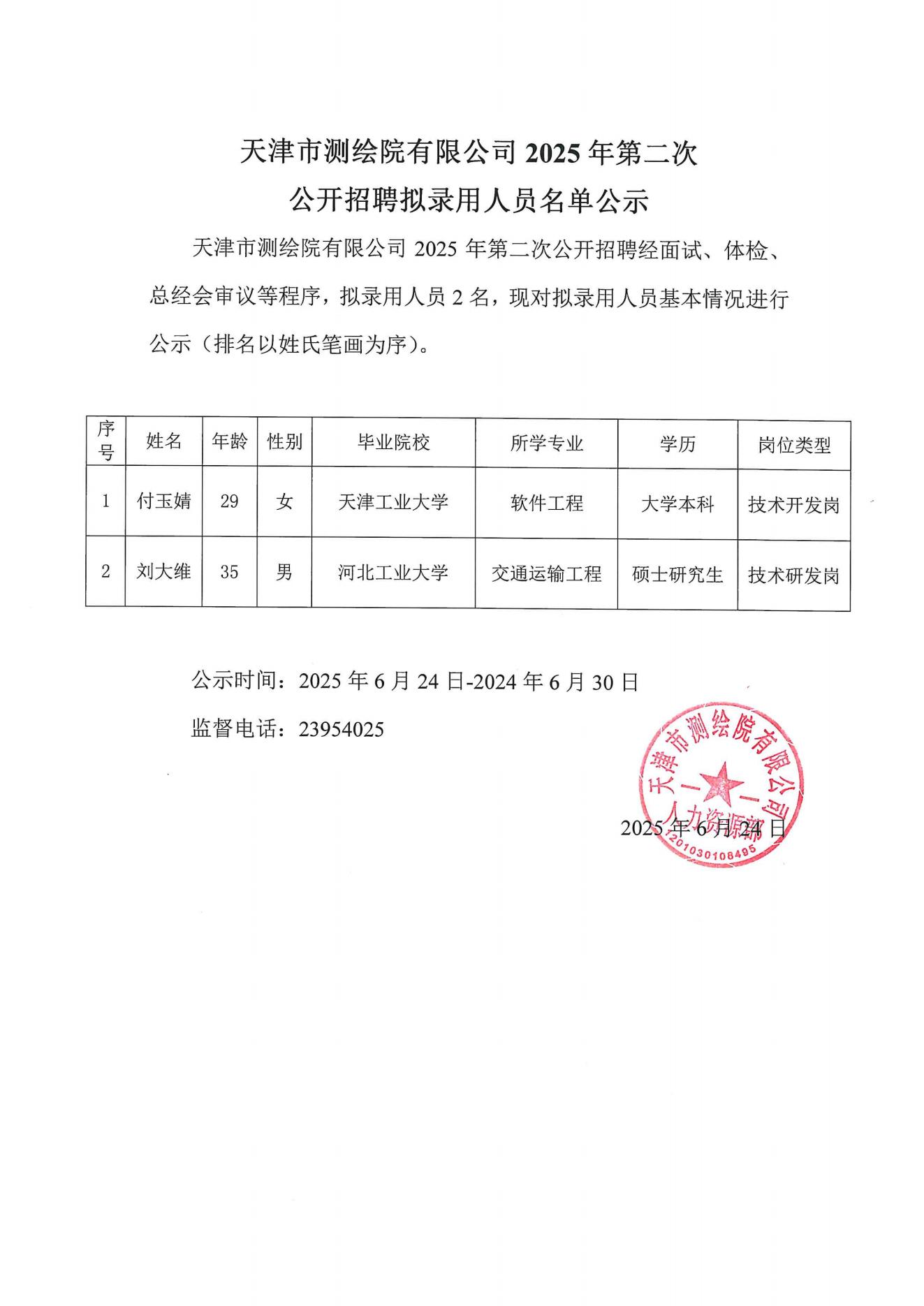 天津市測繪院有限公司2025年第二次公開招聘擬錄用人員公示