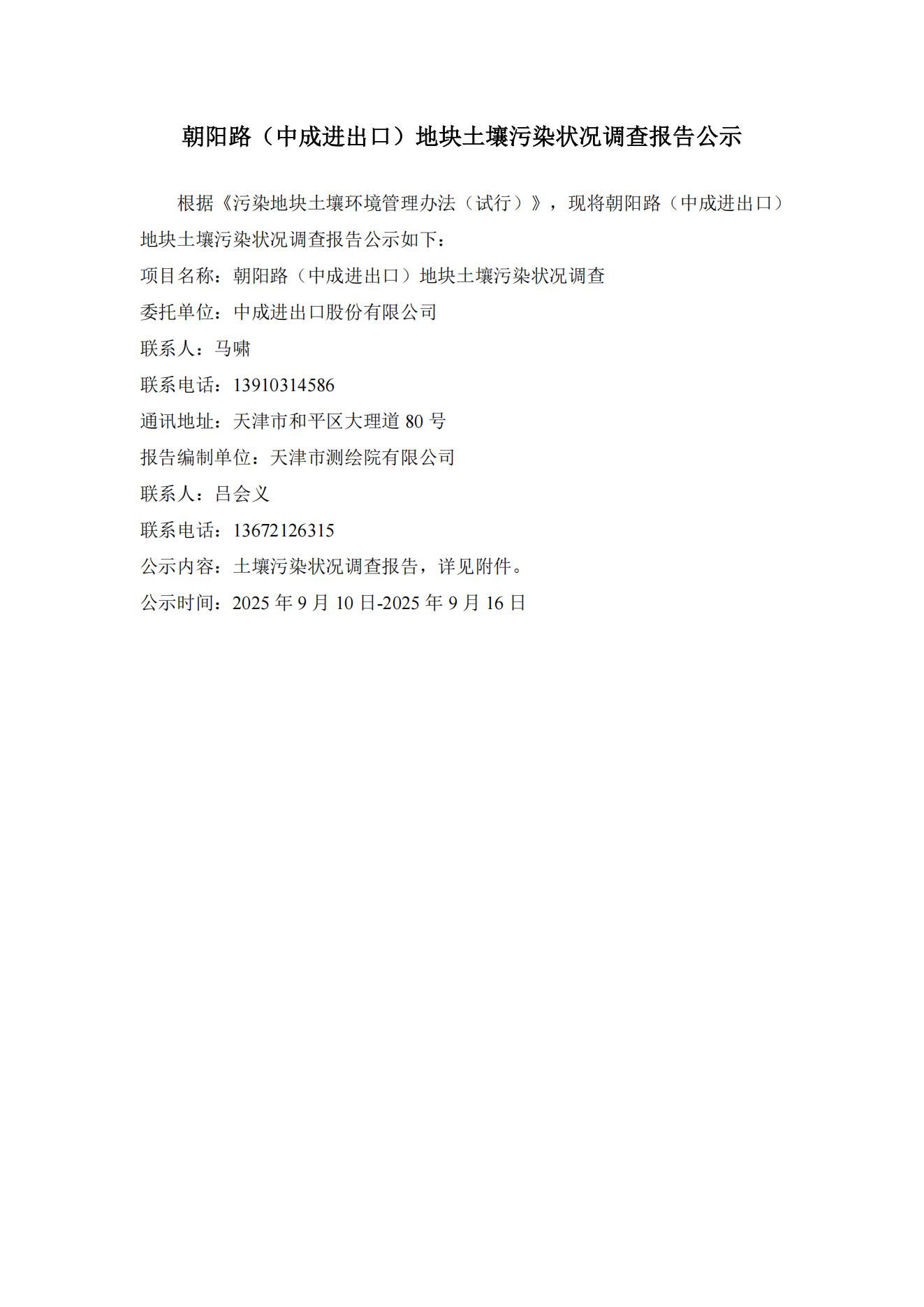 朝陽路(中成進出口)地塊土壤污染狀況調(diào)查報告公示