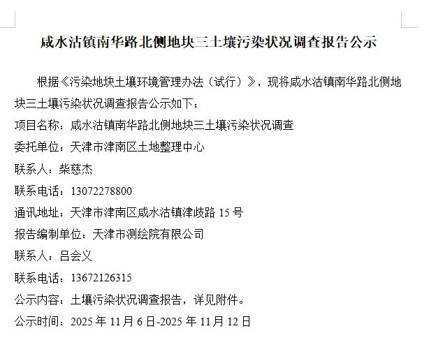 咸水沽鎮(zhèn)南華路北側(cè)地塊三土壤污染狀況調(diào)查報(bào)告公示
