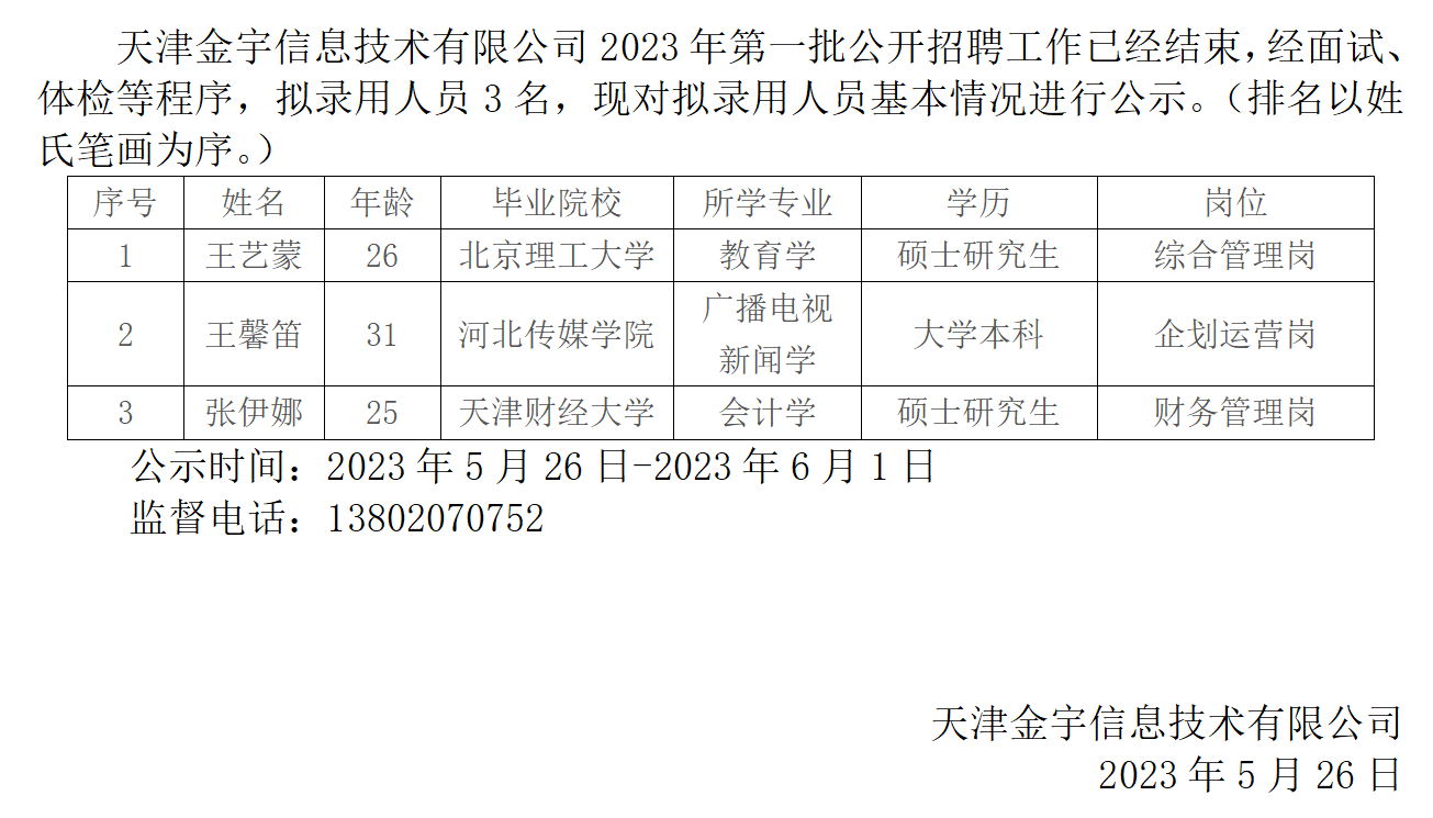 天津金宇信息技術有限公司2023年第一批公開招聘擬錄用人員名單公示