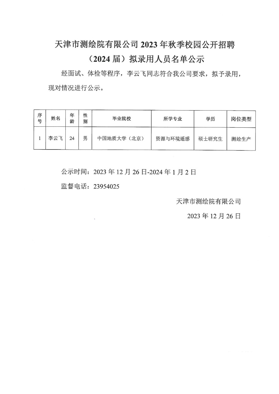 天津市測(cè)繪院有限公司2023年秋季校園公開(kāi)招聘(2024屆)擬錄用人員名單公示 2023-12-26