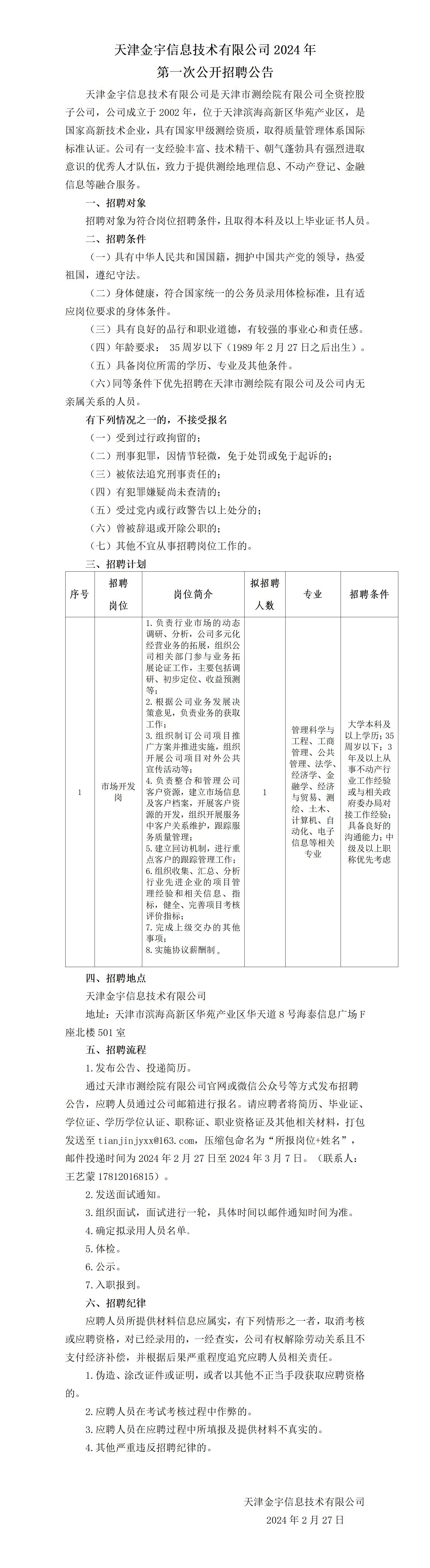 天津金宇信息技術(shù)有限公司2024年第一次公開(kāi)招聘公告 2024-02-27